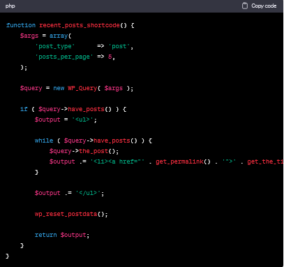In this example, we will define a shortcode named "recent-posts" that will display a list of recent posts generated by the recent_posts_shortcode() function: